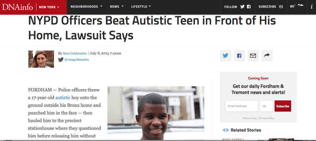 Link to DNA Info Article: https://www.dnainfo.com/new-york/20150708/fordham/nypd-officers-beat-autistic-teen-front-of-his-home-lawsuit-says#.VZ0UjC7vqIY.mailto