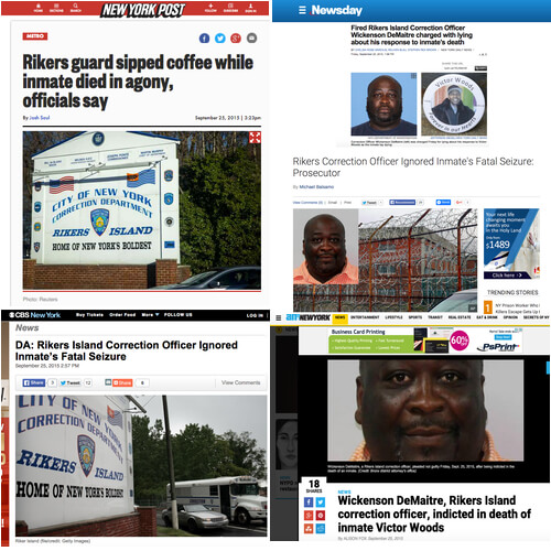 Rikers Correction Officer Ignored Inmate Victor Woods’ Fatal Seizure, DA Says. Link to Article: https://www.newsday.com/news/nation/wickenson-demaitre-rikers-correction-officer-ignored-inmate-victor-woods-fatal-seizure-da-says-1.10891385